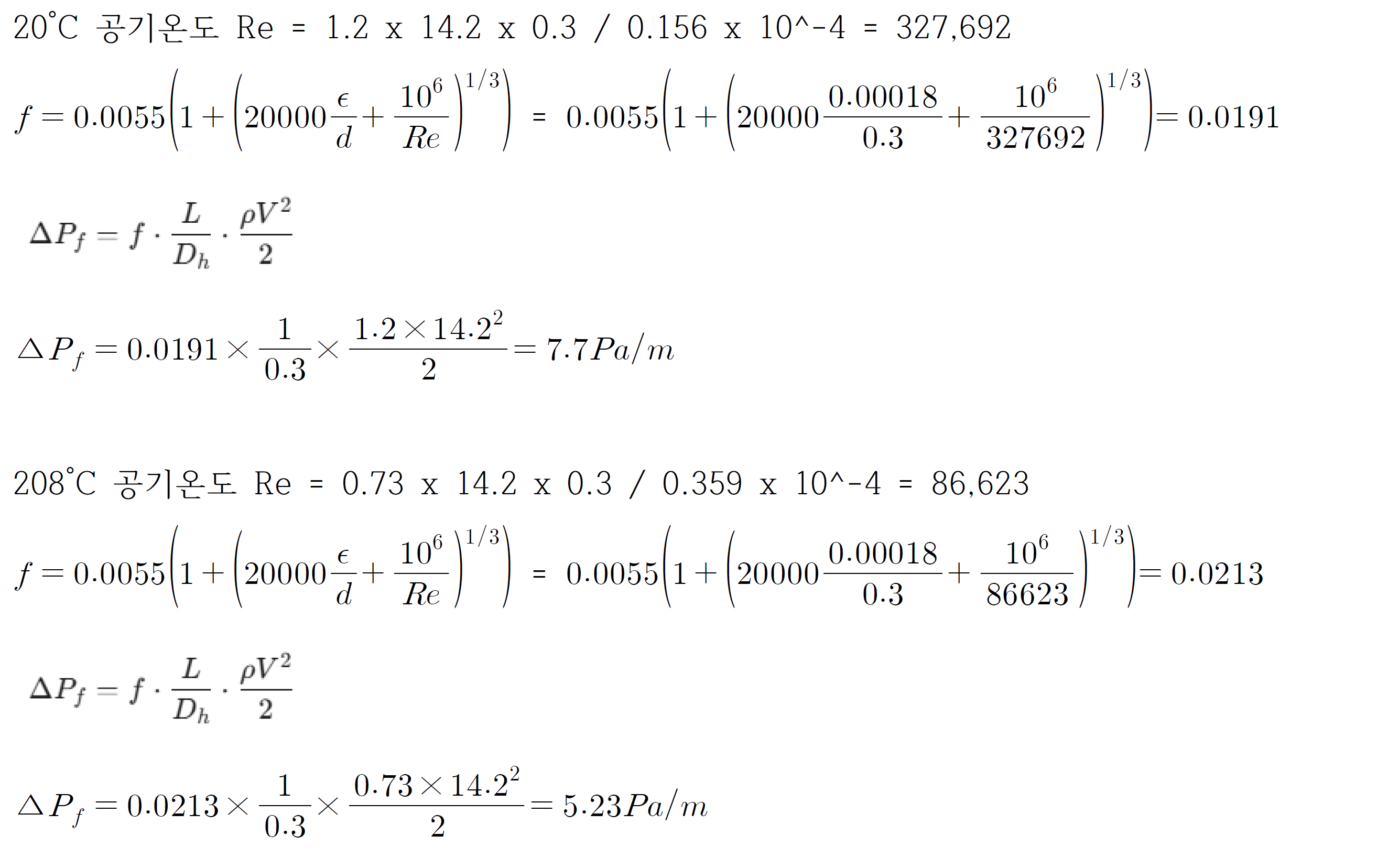 ex) 직경 0.3 m 인 아연도 강판 원형 닥트에 풍량 1 m3/s 가 흐르고 있다. 이때 닥트길이 10 m 의 압력손실은 얼마인가? (아연도 강판닥트의 상대조도 는 0.18 mm 이다.) 이때 압력손실을 공기온도 20도씨와 208도씨 각각 계산 할 것.