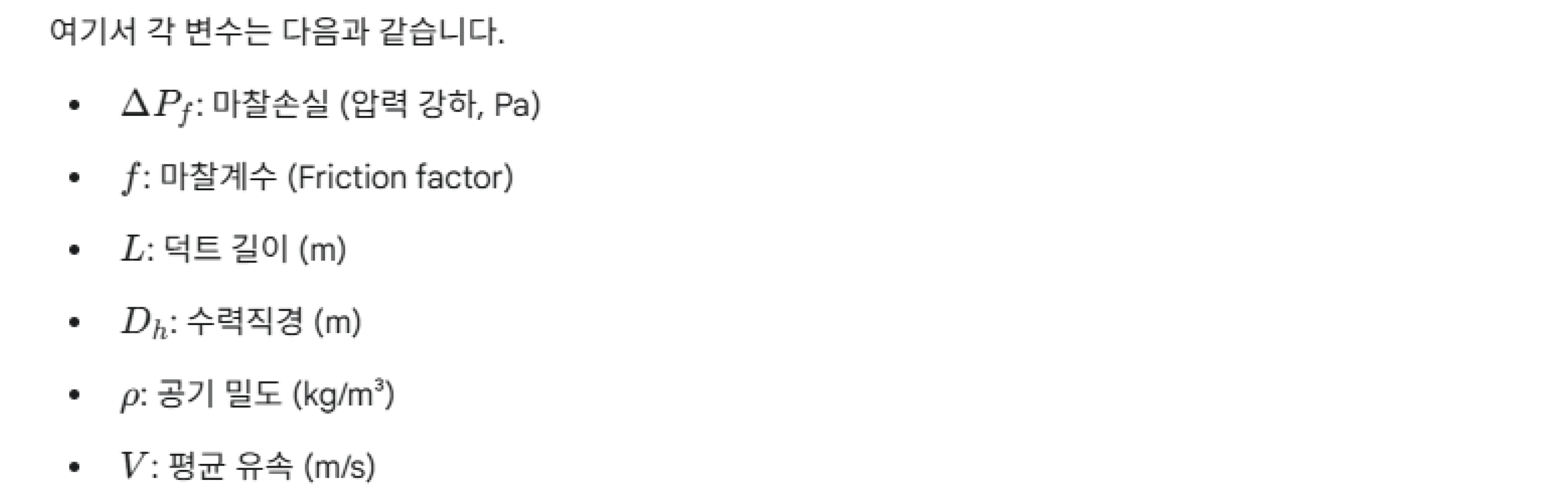 연기온도를 기준으로 계산하지 않는 이유는 20°C 온도가 가장 보수적인 결과를 나타내기 때문이며, 다양한 조건의 화재에 대해 연기온도를 일률적으로 예측하기 어렵기 때문입니다. 다음은 유체가 관로를 흐를 때 마찰손실을 계산하기 위한 달시웨버 방정식입니다.