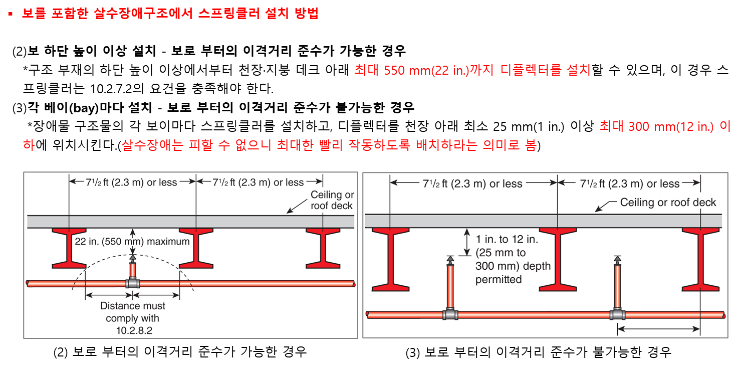 1. 보와 보사이 간격이 2.3m 이하인 경우, 원칙은 천정에서 300mm 이내에 헤드를 배치해야 하지만, 천장에서 최대한 550mm까지 이격할 수 있다. 다만 보하단 아래로 150mm 이상 떨어져서는 안되며, 살수장애 없이 배치해야 한다.