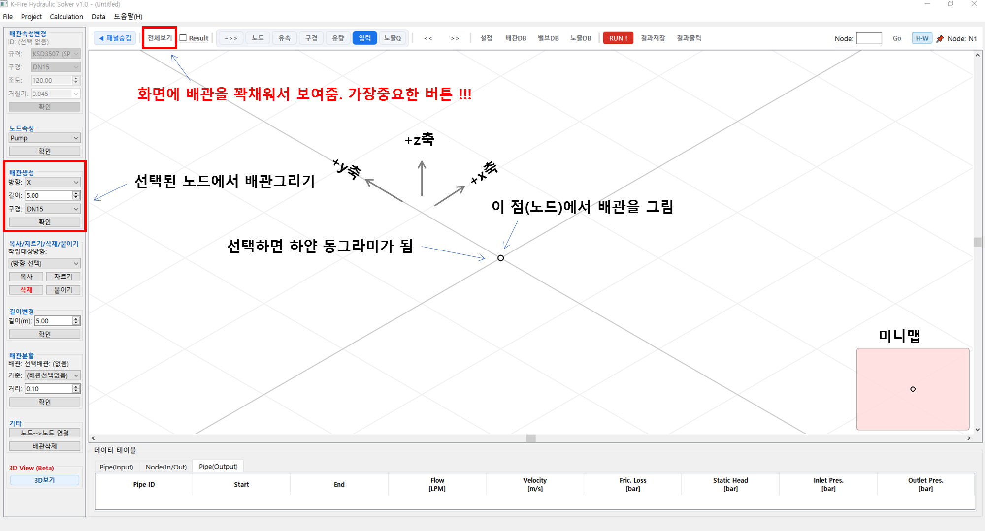 이 프로그램의 목적은 수계소화설비 등의 배관망 해석... 즉 쉽게 이야기 하면 설계에 필요한 유량을 맞추기 위해서 펌프 용량을 계산하거나 반대로 펌프가 운전될 경우 유량이 얼마인지 계산하는것이 목적이기 때문에, 가장 먼저 할일은 배관을 그려야 합니다. 작업 순서는 배관그리기 -> 계산 -> 끝 아주 심플합니다.