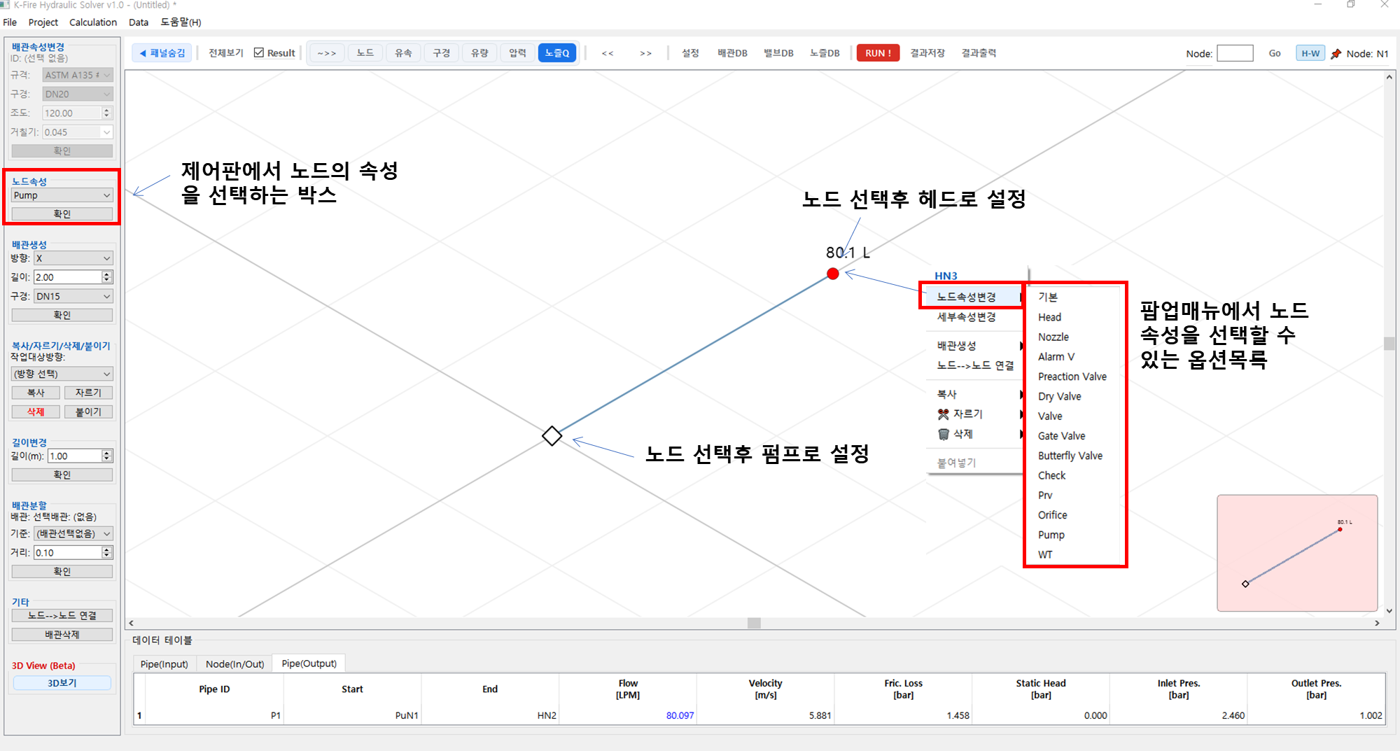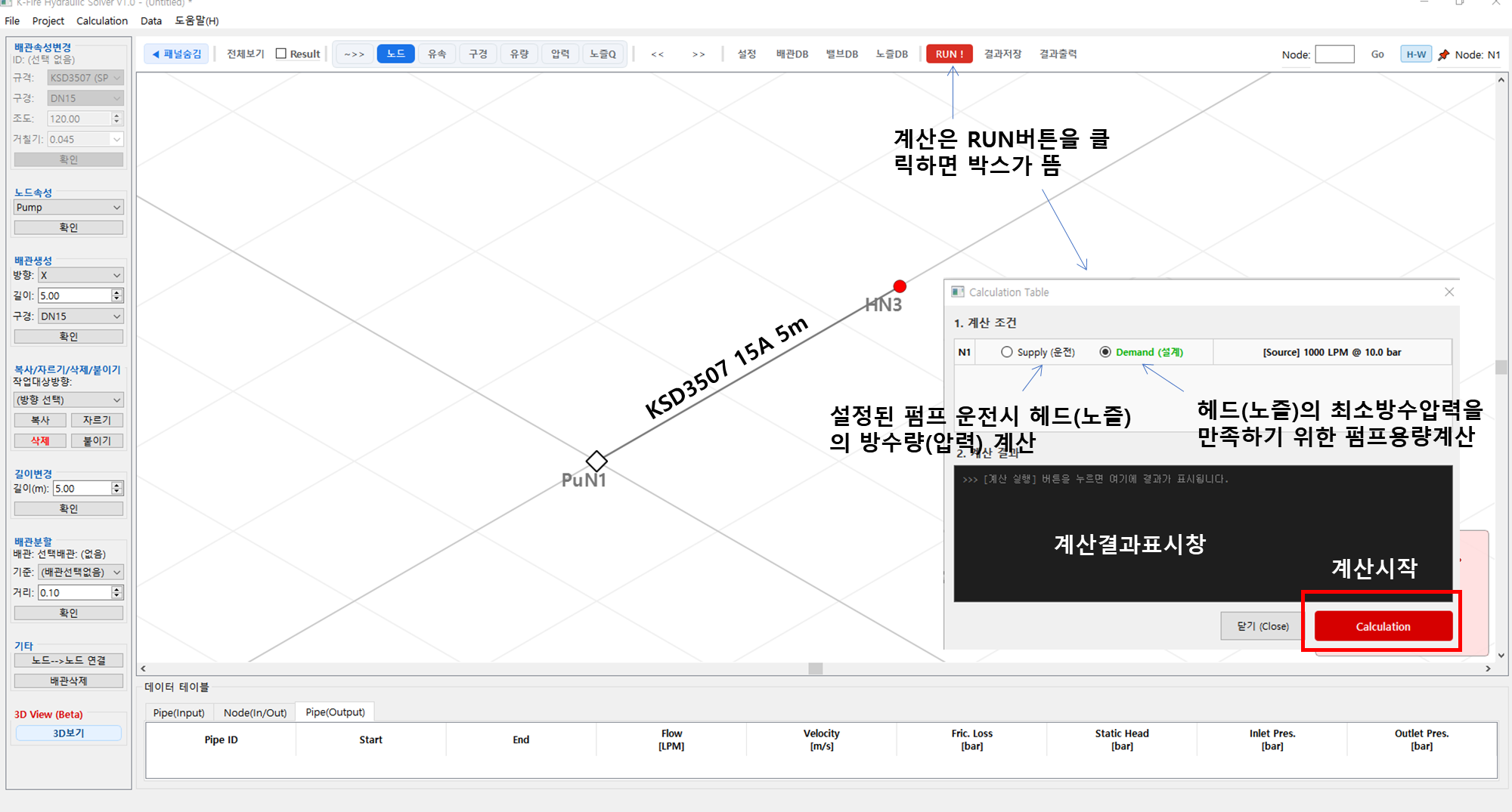 그 다음 계산을 하면 끝납니다. 계산박스에는 두가지 계산방법이 있는데, Demand(설계) 버튼은 가장 기본적인 계산으로 설계용량을 만족하는 펌프용량을 계산합니다 이 예제에서는 헤드의 최소방수압력 1 bar에서 최소방수량 80 L/min을 만족하는 펌프용량을 계산하게 됩니다. Supply(운전) 버튼은 펌프 운전시 헤드로 부터의 압력과 유량을 예측하는 계산이며, 사용자가 펌프의 용량을 직접 입력하여 계산할 수 있습니다.