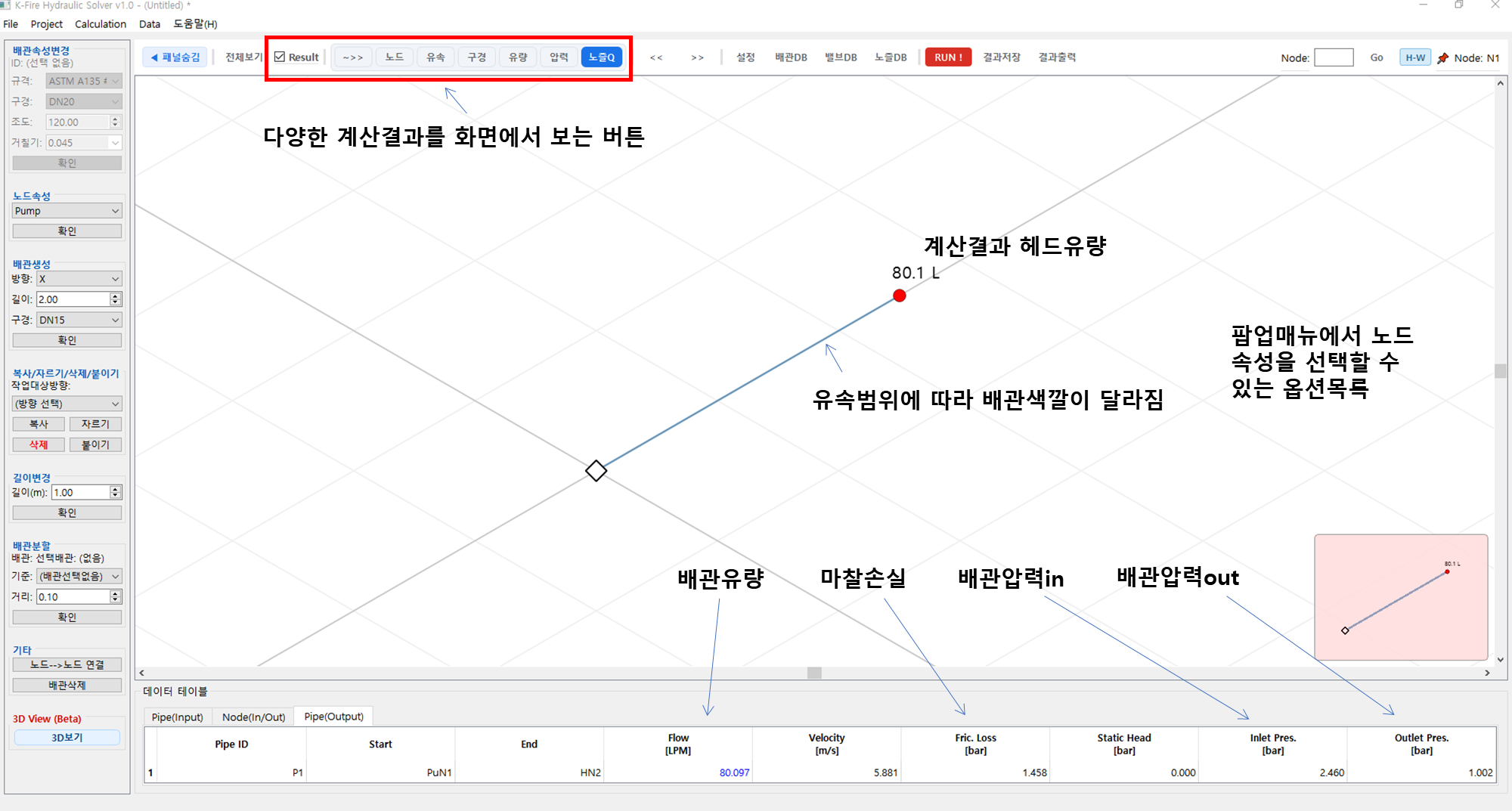 초기화면에서 직관 5m 구경15A KSD3507 배관에 스프링클러헤드 K80을 연결한 후 펌프 용량을 계산하기로 합니다. 펌프용량은 헤드의 최소 방수량 80 L/min을 만족하기 위한 용량이 되겠죠. 이미 필요한 유량은 정해졌으므로 펌프의 양정만 계산합니다. 양정은 80 L/min의 물이 5m 직관을 흘러가면서 발생하는 마찰손실에 헤드의 방수압력 1 bar를 더 한 값이므로 마찰손실만 계산하면 수계산으로도 간단히 구할 수 있습니다. 그러면 프로그램을 이용하여 계산해보겠습니다.