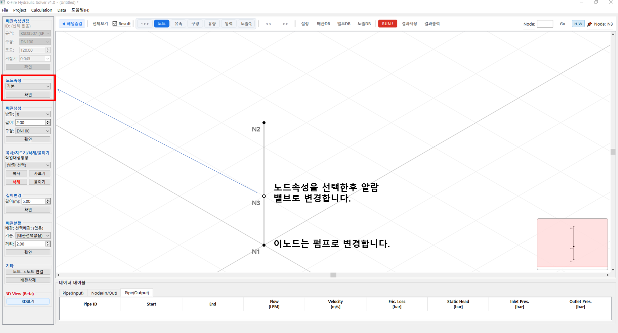N3노드의 속성을 알람밸브와 맨처음 노드N1은 펌프로 변경합니다.