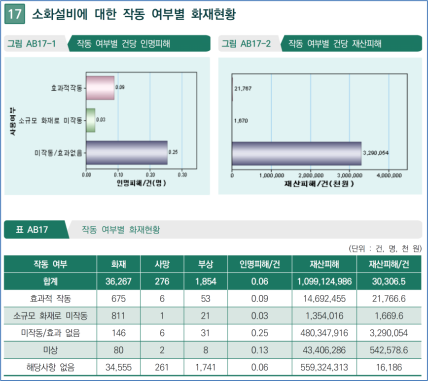 이는 소화설비가 정상적으로 작동한다면 인명과 재산피해를 상당부분 감소시킬 수 있으나, 재산피해에 비해 인명피해의 감소율은 매우 낮은 것을 볼 때 소화설비의 주된 목적은 재산피해의 최소화로 보아야 할 것 같습니다. 이부분에 대해서는 별도로 논의해볼 생각입니다.