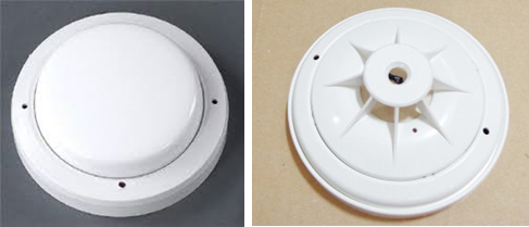 그림2는 차동식열감지기의 경우 바이메탈방식(좌), 반도체방식(우)에 따라 외관의 형태가 조금 다릅니다. 특히 반도체방식의 경우에는 정온식과 비슷하게 생겼기 때문에 명판의 표시를 확인해야 알 수 있습니다.