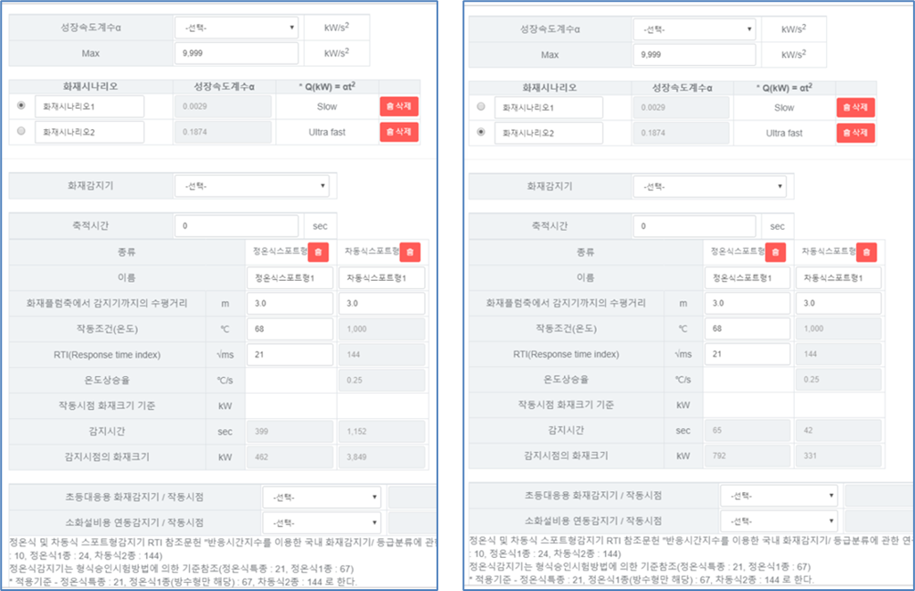 그림1은 일반적인 공간에서 화재성장속도가 매우 느린 경우와 매우 빠른 경우 두가지 환경에서 정온식과 차동식감지기의 작동시간을 계산한 것입니다. 감지기는 가장 많이 설치하는 특종 정온식과 2종 차동식으로 선정하였으며, 계산툴은 미국의 NIST에서 제공하는 C-Fast 프로그램을 기반으로 하였습니다. 계산프로그램은 국가화재평가원에서 무료로 제공하는 http://tool.kfsl.co.kr/login 의 화재안전계산툴 메뉴를 통해 이용이 가능합니다.