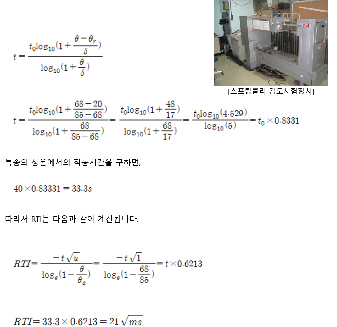 스프링클러의 경우 RTI값을 제공받을 수 있어 공학계산을 통해 작동시점 계산이 가능하지만 정온식스포트형감지기의 경우에는 특종과 1종으로 구분되어 있을뿐 RTI값을 알 수가 없습니다. 그래서 감지기 검정시 풍동시험테스트 기준을 근거로 특종과 1종에 대해 RTI값을 산출해보았습니다. 본 자료는 참고자료로만 활용하시기 바랍니다.
