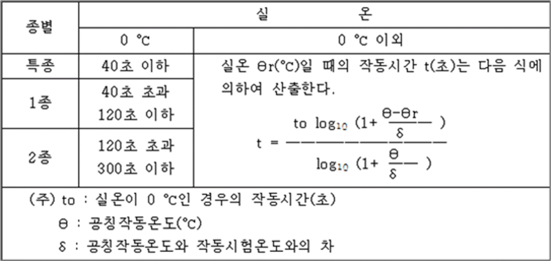 공칭작동온도의 125 %가 되는 온도이고 풍속이 1 m/s인 수직기류에 투입하는 경우 그 종별에 따라 다음 표에 정하는 시간 이내에 작동하여야 한다.